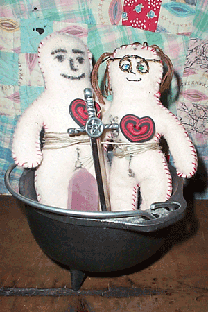 My Soul Mate PoppetsOK, here they are, such they are. :-) Tried to keep the guy poppet as indescript as possible, hence the happy face drawn on with the marker. Cute, aren't I? lol! Love that 'do. I'm not much of a poppet designer, but they are filled with magickal intent.
